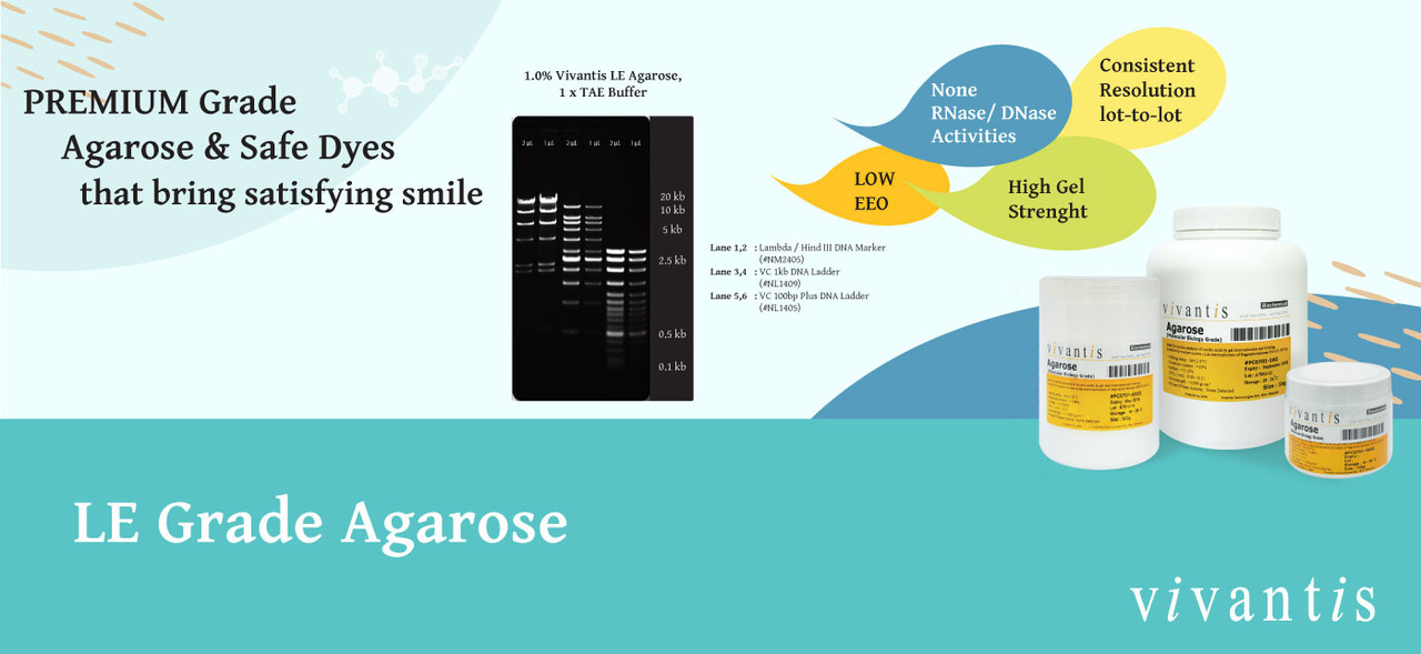 Vivantis LE Grade Agarose is ideal for routine analysis of nucleic acids by gel electrophoresis and blotting. Each gel sharply resolves DNA and provides consistent resolution from lot-to-lot.