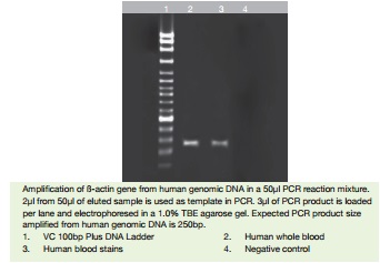 The GF-1 Forensic DNA Extraction Kit is designed for rapid and efficient purification of DNA from traces of biological materials such as blood stains, saliva, semen, hair and nail for clinical and forensic analysis. The purification is based on the usage of denaturing agents to provide efficient cell lysis, denaturation of proteins and subsequent release of DNA. Special buffers provided in the kit are optimized to enhance the binding of DNA onto a specially-treated glass filter membrane for efficient recovery of highly pure DNA.