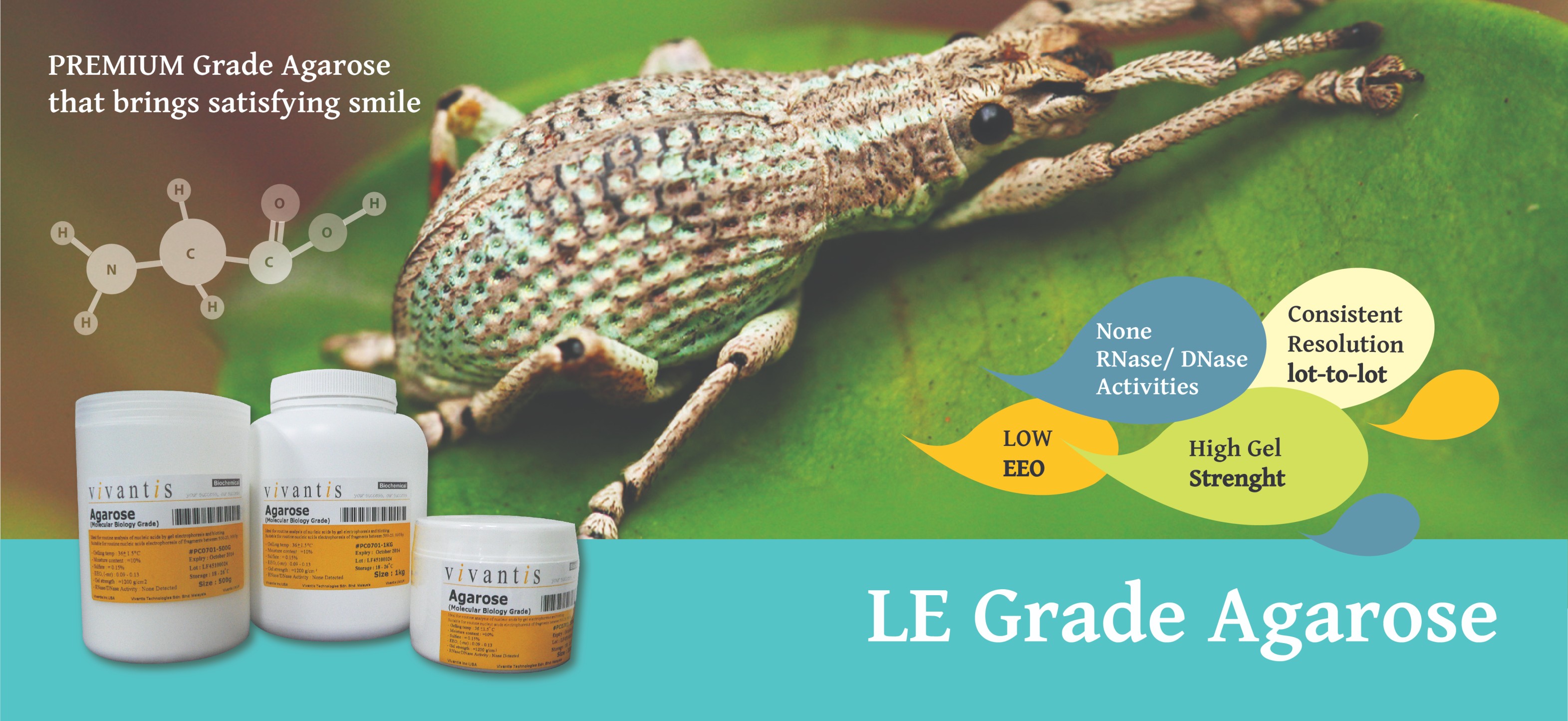 Vivantis LE grade agarose is ideal for routine analysis of nucleic acids by gel electrophoresis and blotting. Each gel sharply resolves DNA and provides consistent resolution from lot-to-lot. This molecular biology grade agarose has no detectable DNase or RNase activity and forms strong gels with low background upon ethidium bromide, SYBR® Green, or GelStar® staining. Due to its low EEO, DNA will have a high electrophoretic mobility. LE grade agarose is also recommended for protein gel electrophoresis in applications such as Ouchterlony and radial immunodiffusion (RID).